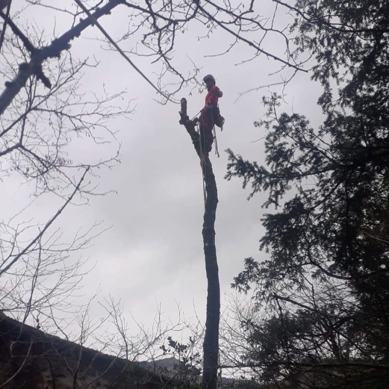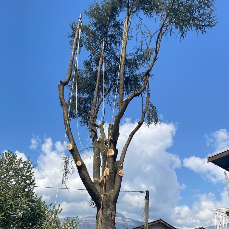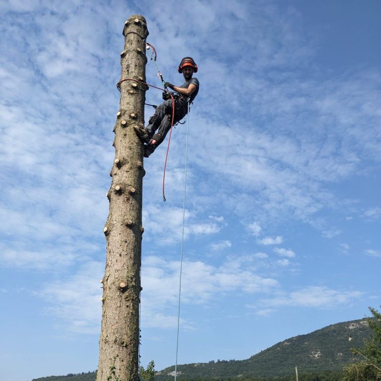 L’abattage par démontage consiste à abattre un arbre morceau par morceau (branches puis tronc), quand on ne peut pas le faire tomber d’un seul tenant.